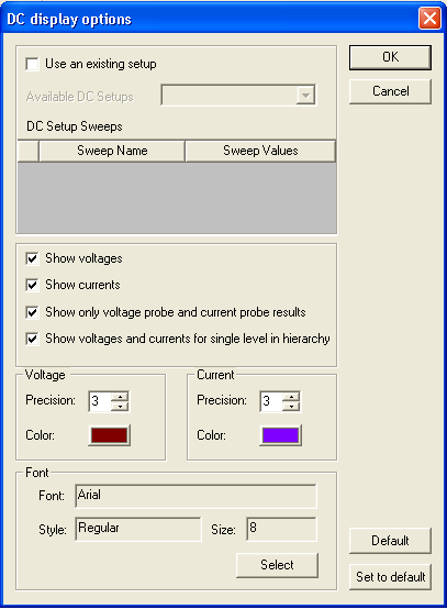 Select Show DC Bias to run the analysis and display the results on the schematic. To remove the DC bias information from the schematic, toggle Show DC Bias. After the first DC bias analysis has been run, select Update to recalculate the bias values after making changes to the circuit. Select Display Options to open the DC display options dialog:
