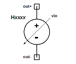 Linear CCVS Netlist ExamplesH23 inplus inminus CCVS V23 GAIN=2.0e-5 H11 34 35 CCVS V25 GAIN=1.0e-2 NotesThe functional equation for the linear CCVS is: V(out+) - V(out-) = GAIN ´ I(vin) ´ SCALE ´ M ´ (1 + DT ´ (TC1 + DT ´ TC2)) If the result is less than MIN, V(out+) - V(out-) = MIN If the result is greater than MAX, V(out+) - V(out-) = MAX