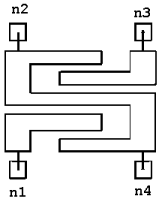 F=val n1, n2, n3, and n4 are the names of the nodes attached to the coupler. The entry COMPONENT=cpwlange_electrical identifies the element. The SUBSTRATE=substrate_name is the coplanar waveguide substrate model name selected for the design (see Selecting a Coplanar Waveguide Substrate for details).