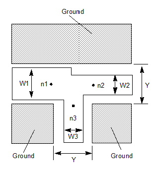 Y=6.0e-4 where CPW1, the selected layout technology or substrate type, has a definition such as: .SUB CPW1 CPW( Notes1. The lines connected to nodes n1 and n2 are collinear, with conductor widths W1 and W2. The perpendicular line is connected to node n3 and has center conductor width W3. The ground-to-ground distance Y is the same for all ports. 2. For accurate results, the substrate definition