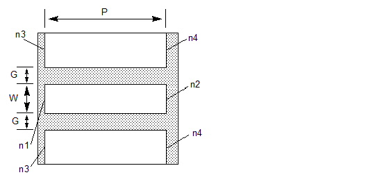 [G=val] n1 and n2 are the names of the nodes attached to the transmission line. n3 and n4 are the reference nodes. The entry COMPONENT=gcpwtrl identifies the element as a grounded coplanar waveguide transmission line, physical length. The SUBSTRATE=substrate_name is the grounded coplanar waveguide substrate model name selected for the design (see Selecting a Grounded Coplanar Waveguide Substrate for details).