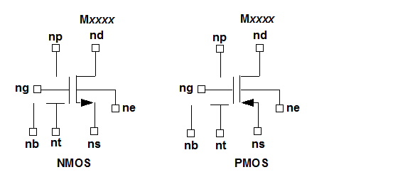 ![]() BSIM3-SOI MOSFET Instance Netlist SyntaxThe syntax for a LEVEL=57 BSIM3-SOI v2.0.1 MOSFET instance is: Mxxxx nd ng ns ne [np] [nb] modelname [L=length] [W=width] [AD=val] [AS=val] [PD=val] [PS=val] [NRD=val] [NRS=val] [NRB=val] [RTH0=val] [CTH0=val] [NBC=val] [NSEG=val] [PDBCP=val] [PSBCP=val] [AGBCP=val] [AEBCP=val] [TNODEOUT=val] [FRBODY=val] [BJTOFF=val] [M=val] nd is the drain node, ng is the front gate node, ns is the source node, ne is the back gate or substrate node, np is the external body contact node, and nb is the internal body node of the MOSFET. modelname is the name of a BSIM3-SOI MOSFET model defined in a .MODEL statement elsewhere in the netlist. When the option WL is in effect (on the .OPTION statement), the syntax becomes: Mxxxx nd ng ns [nb] modelname [width] [length] [AD=val] [AS=val] [PD=val] [PS=val] [NRD=val] [NRS=val] [NRB=val] [RTH0=val] [CTH0=val] [NBC=val] [NSEG=val] [PDBCP=val] [PSBCP=val] [AGBCP=val] [AEBCP=val] [TNODEOUT=val] [FRBODY=val] [BJTOFF=val] [M=val]
