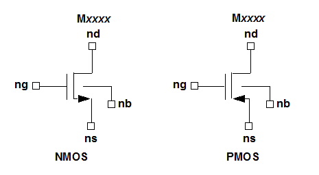 [LGDRAIN=val] [LSGSOURCE=val] nd is the drain node, ng is the gate node, ns is the source node, and nb is the bulk or substrate node of the MOSFET. modelname is the name of a Level 69 PSP 102.1 MOSFET model defined in a .MODEL statement elsewhere in the netlist.