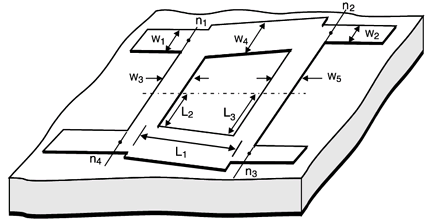 ![]() Netlist FormatA branch line coupler length instance has the following netlist format: AMSCOUPBxxx n1 n2 n3 n4 W1=val W2=val W3=val W4=val W5=val L1=val L2=val L3=val COMPONENT=branch_coupler SUBSTRATE=substrate_name n1, n2, n3, and n4 are the names of the nodes attached to the coupler. The entry COMPONENT=branch_coupler identifies the element. The entry SUBSTRATE=substrate_name identifies the microstrip substrate model name selected for the design (see Selecting a Microstrip Substrate). See the Microstrip (MS) Substrate for information on this substrate type.