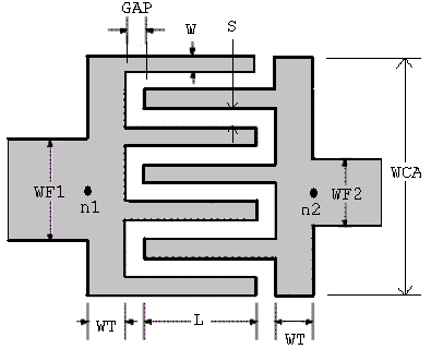 where FR4, the selected layout technology or substrate type, has a definition such as: .SUB FR4 MS( H=7.6200e-004 Er=4.4 TAND=0.02 TANM=0 Notes1. The feedline widths WF1 and WF2 must be less than or equal to the total width of the capacitor: WF1 <= WCA and WF2 <= WCA. 2. The finger width W and the spacing between adjacent fingers S are the same for all fingers. 3. The model takes into account the effect of the steps from the feedlines to the terminal strips. 4. The capacitor width WCA has a default value of (N*W + S*(N-1)). WCA can be set to a value larger than the default. An error results if WCA is set to less than the default.