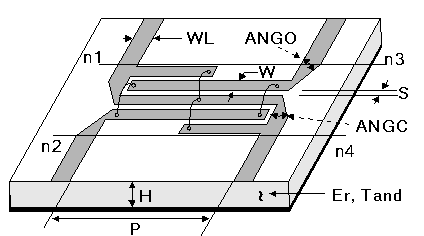 n1, n2, n3, and n4 are the names of the nodes attached to the coupler. The entry COMPONENT=mslange_physical identifies the element. The entry SUBSTRATE=substrate_name identifies the microstrip substrate model name selected for the design (see Selecting a Microstrip Substrate). See the Microstrip (MS) Substrate for information on this substrate type.