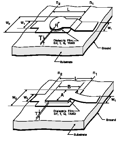 ![]() Netlist FormAxxxx n1 n2 W1=val W2=val L=val C=val ER=val Q=val COMPONENT=msmimcq SUBSTRATE=substrate_name n1 and n2 are the names of the nodes attached to the capacitor. The entry COMPONENT=msmimcq identifies the element as a MIM rectangular capacitor, C and Q specified, microstrip substrate. The entry SUBSTRATE=substrate_name identifies the microstrip substrate model name selected for the design (see Selecting a Microstrip Substrate). See the Microstrip (MS) Substrate for information on this substrate type.