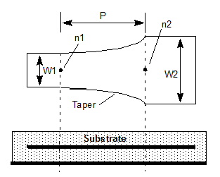 Netlist ExampleA2 Port1 Port2 W1=0.001 W2=0.003 P=0.01 TAPER=LinWidth where FR4, the selected layout technology or substrate type, has a definition such as: .SUB FR4 MS( H=7.6200e-004 Er=4.4 TAND=0.02 TANM=0 Notes1. [All substrates] Node numbers can be reversed, so that n1 and associated width W1 are at the wide end of the taper. 2. [All substrates] The Nexxim linear width tapered line element has a physical footprint in Designer. 3. [Microstrip] The substrate definition