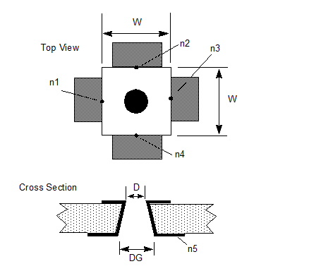 n1 through n5 are the names of the nodes attached to the via pad. Any nodes not specified are modeled as open stubs. The entry COMPONENT=viapad identifies the element as a via pad.The entry SUBSTRATE=substrate_name identifies the microstrip substrate model name selected for the design (see Selecting a Microstrip Substrate). See the Microstrip (MS) Substrate for information on this substrate type.