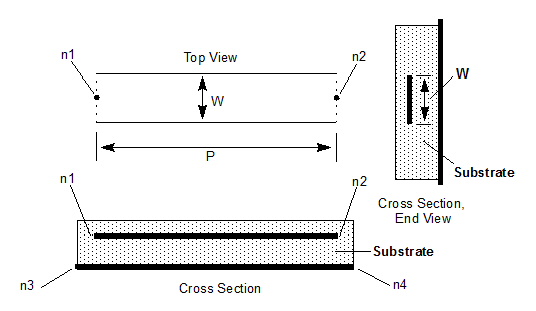 ![]() ![]() Netlist FormatAn instance of a transmission line with physical length and reference nodes has the following netlist syntax: Axxx n1 n2 n3 n4 [W=val]