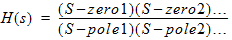 Notes1. The element is specified using a transfer function given as the ratio of two expressions in the complex variable s. The bold brackets for the POLES and ZEROS entries are required. The function of the device is expressed as: The transfer function H(s) is specified by giving the coefficients: