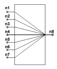 ![]() Netlist FormAn instance of a 7-way power combiner/divider has the following Nexxim netlist syntax: Axxx n1 n2 n3 n4 n5 n6 n7 n8 [IL=val][RO=val] COMPONENT=power_combiner_n n1 through n8 are the nodes connected to the combiner/divider. The entry COMPONENT=power_combiner_n is required.