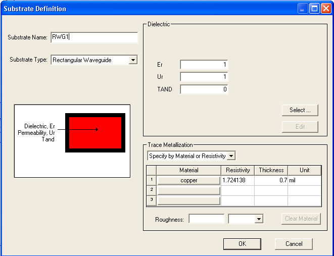Nexxim Simulator > Creating a Custom Rectangular Waveguide SubstrateTo create a rectangular waveguide substrate definition, open the Nexxim design icon (“Nexxim1” for example), then right-click on the Add Reference Data field. Select Add Substrate Definition from the pulldown. The Substrate Definition window opens. Specify the name of your new substrate (the example below uses the name “RWG1”):