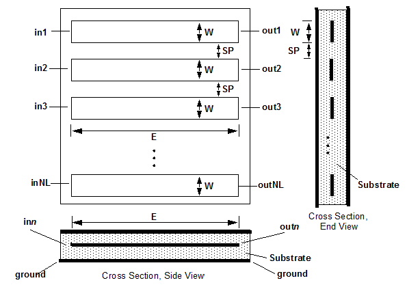 ![]() Netlist FormA multiple coupled line, electrical length instance has the following netlist syntax: Axxx in1 [...inNL] out1 [...outNL] NL=NumberofLines [W=width] [SP=spacing] [E=length] [F=freq] COMPONENT=MCPL SUBSTRATE=substrate_name in1 through inNL are the names of the input nodes. out1 through outNL are the corresponding output nodes. The entry COMPONENT=MCPL identifies the element as a multiple coupled line. The entry SUBSTRATE=substrate_name identifies the Stripline substrate model name selected for the design (see Selecting a Stripline Substrate). See the Stripline (SL) Substrate for information on this substrate type.