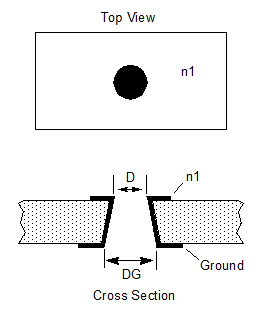 [DG=val] n1 is the name of the node attached to the via through hole. The other node is ground, and is not specified in the syntax. The entry COMPONENT=viahole identifies the element as a via through hole. The entry SUBSTRATE=substrate_name identifies the Stripline substrate model name selected for the design (see Selecting a Stripline Substrate). See the Stripline (SL) Substrate for information on this substrate type.