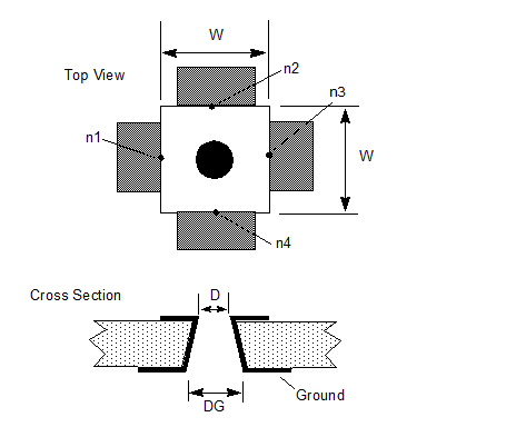 ![]() Netlist FormatA via pad instance has the following netlist format: Axxx n1 [n2 n3 n4] [D=val] [DG=val] [W=val] COMPONENT=viapad SUBSTRATE=substrate_name n1 through n4 are the names of the nodes attached to the via pad. Any nodes not specified are modeled as open stubs. A fifth node is connected to ground, and is not shown in the syntax. The entry COMPONENT=viapad identifies the element as a via pad. The entry SUBSTRATE=substrate_name identifies the Stripline substrate model name selected for the design (see Selecting a Stripline Substrate). See the Stripline (SL) Substrate for information on this substrate type.