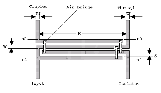 E=75 where SS1, the selected layout technology or substrate type, has a definition such as: .SUB SS1 SS ( Notes1. The conductor width of all fingers is W. The diatance between all fingers is S. 2. The number of fingers, N, must be 4. 3. Port 1 is the input port, port 2 is the coupled port, port 3 is the through port, and port 4 is the isolated port. 4. The length of air bridges used to approximate their parasitic effects, is 2*(W+S).