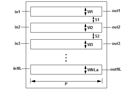 [...outNL] in1 through inNL are the names of the input nodes. out1 through outNL are the corresponding output nodes. The entry COMPONENT=ss_mcpl_a identifies the element as an asymmetric multiple coupled line, physical length. The entry SUBSTRATE=substrate_name identifies the suspended stripline substrate model name selected for the design (see Selecting a Suspended Stripline Substrate). See the Suspended Stripline (SS) Substrate for information on this substrate type.