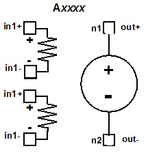 ![]() Linear VCVS Netlist FormatThe format for a multiplier voltage-controlled voltage source (VCVS) is: Axxxx out+ out- in1+ in1- in2+ in2- [SCALE=scale] [TC1=val] [TC2=val] COMPONENT=vcvs_multiplier out+ is the positive node and out- is the negative node of the voltage source. in1+ and in1- are the positive and negative nodes for the first input voltage, in2+ and in2- are the positive and negative nodes for the second input voltage. The entry COMPONENT=vcvs_multiplier is required.