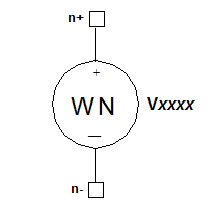 ![]() Voltage White Noise Source Netlist FormatA voltage white noise source is just a DC=0 voltage source with a NOISEVEC parameter: VWHITENOISExxxx n+ n- DC=0 NOISEVEC=[1,psd, 1.1,psd] n+ is the positive node and n- is the negative node of the voltage source. The NOISEVEC parameter applies the specified power spectral density across all frequencies.