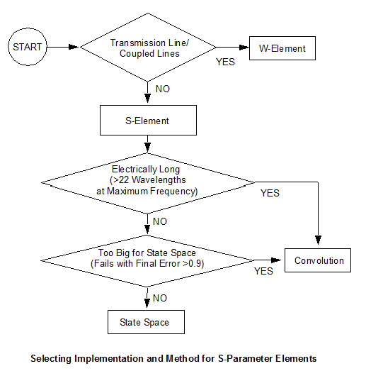 Nexxim Simulator > Troubleshooting S-Parameter IssuesThis topic shows how to select the correct S-parameter representation for your design and suggests ways to employ selected S-element options to minimize errors. Selecting the Correct Element and MethodThe flow chart below outlines the process of selecting the correct implementation for an element defined by S-parameters. The two main choices are between the S-element and the W-element, and then, for the S-element, between the default state-space representation and the convolution method.