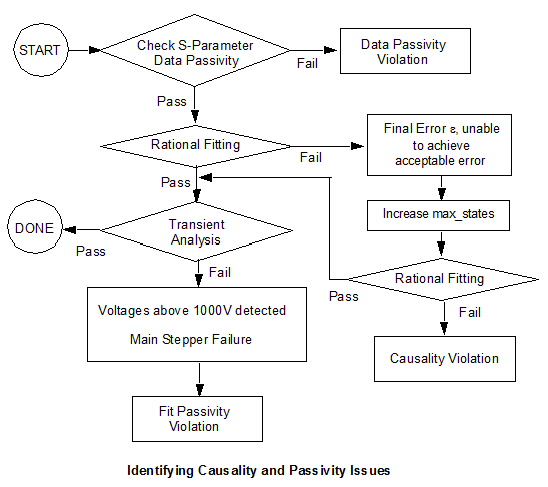 Identifying Passivity ProblemsPassivity violations can be detected in the original S-parameter data and rejected if they are serious. Mild passivity errors in the data may persist in the state space realization, and more serious passivity errors may be introduced by the fitting algorithms. State space passivity violations may result in errors during Transient analysis such as exponential growth of the voltages at the ports of the S-parameter block or time steps below minimum. Identifying Causality ProblemsCausality violations can lead to errors during the calculation of the rational fit to the S-parameter data. The final error (e in the diagram) indicates the magnitude of the fitting error. To verify that the problem is due to causality issues, increase s_element.max_states from 128 to 200 or 300 and retry. Increasing the maximum number of states per entry in the state space formulation works best when the S-parameter data are for a linear network rather than for a transmission line. The next sections give some suggestions for dealing with passivity and causality issues. Troubleshooting Passivity IssuesPassivity issues may be resolved by improving the initial rational fit or by applying a passivity enforcement algorithm to the state space matrices after the initial fitting. Improving the Rational FitImproving the rational fitting approximation can minimize passivity issues in some cases. Set the s_element.column_fit option from default 1 to 0 or 2. 0=Fit each entry separately, then combine them at the end. 1=Fit one column at a time. 2=Do the entire matrix at once, using symmetry if present. Column_fit =1 and 2 work best for systems with many ports but with a short electrical length, like a chip package. Increase the s_element.rational_fitting_iteration_limit option from default 2 to a higher number, 10 or 20. Increasing the maximum number of iterations improves the fit at the cost of simulation time. Decrease the option s_element.reltol from default 1e-2 to 1e-3. Tightening the tolerance used for state space fitting may help with passivity problems, but could result in overfitting with non-causal data. Enforcing PassivityPassivity enforcement postprocesses the state-space matrices, making sure that the fitted S-parameters are passive. By default, no passivity enforcement is enabled. Three methods of passivity enforcement are available in Nexxim: an iterated fitting method, a convex programming method, and a perturbation method. All three methods add time to the simulation, but produce results that are accurate with respect to the original data. See the S-Parameter Technical Notes for details on these methods. For most passivity problems, set s_element.enforce_passivity=7 to invoke the Iterated Fitting of Passivity Violations (IFPV) method. IFPV is the fastest of the three methods. If the system has no more than ten ports (inputs and outputs combined), set s_element.enforce_passivity=1. Enforce_passivity=1 uses a convex programming method to enforce the passivity of the state-space mode. Enforce_passivity=1 automatically sets mor=1, since the passivity enforcement algorithm runs more quickly after model-order reduction. If the system has more than ten ports (inputs and outputs combined), set s_element.enforce_passivity=6. With this setting, Nexxim uses a perturbation method for enforcing the passivity of the state-space matrices. Other Useful State-Space OptionsHere are some other S-element options that may be useful in dealing with state-space issues. Error ToleranceBy default, the error tolerance for S-parameter elements is based on the absolute difference between each entry of the fit and the corresponding entry of the S-parameter data. This scheme may not work well for some cases with very small off-diagonal S-parameter entries. The option s_element.by_entry=1 sets Nexxim to treat the error tolerance as relative to the size of S-parameter matrix entry. Model-Order Reduction OptionBy default, the order of the state-space model is the order as calculated from the data. Reduction converts the state-space fit to a smaller one than the default, while maintaining the original accuracy. Reduction makes the transient simulation run more quickly, but at an up-front cost, so it works best when running a long simulation (one where the ratio of TSTOP to TSTEP is particularly large). Set s_element.mor to 1, 2, 3, 4, or 5 to perform model-order reduction on the state-space model in transient analysis. Settings for model-order reduction are tabulated below: