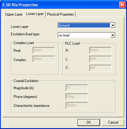 b. Select a load type from the Excitation/load type pulldown menu. If the top layer contains the load, select coaxial excitation as the load type. You may only define a load at one end of the probe. The load on the other end is then set to zero.