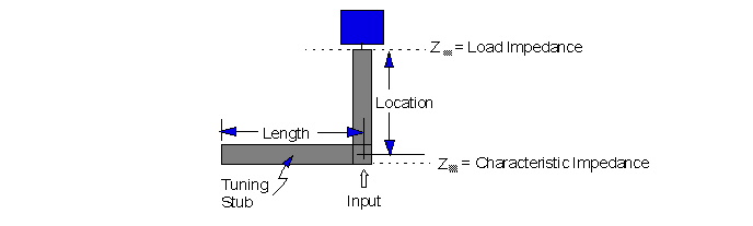 The following figure displays the location and line length for an open-ended stub. The width of the stub is assumed to be the same as the width of the microstrip line specified in the input area:
