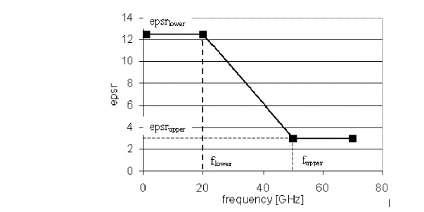HFSS and Planar EM Simulators > Frequency-Dependent Material PropertiesThe properties of some materials vary with the frequency of the field excitation. This frequency dependence is often linear within a certain frequency range and constant outside of the frequency range, as shown below, ![]() where epsrlower is the relative permittivity of a material below the frequency range 20 - 50 GHz. epsrupper is the relative permittivity of a material above the frequency range 20 - 50 GHz. flower is the lower frequency, below which the material property is constant. fupper is the upper frequency, above which the material property is constant. In general, to account for this variance within a given frequency range, use the Piecewise Linear Material Input window dialog box to specify a property’s values at frequencies below and above the frequency range. Based on these values, Ansoft Designer automatically creates a linear dataset that specifies the property’s values at the desired frequencies during solution generation. This dataset can be modified with additional points if desired.