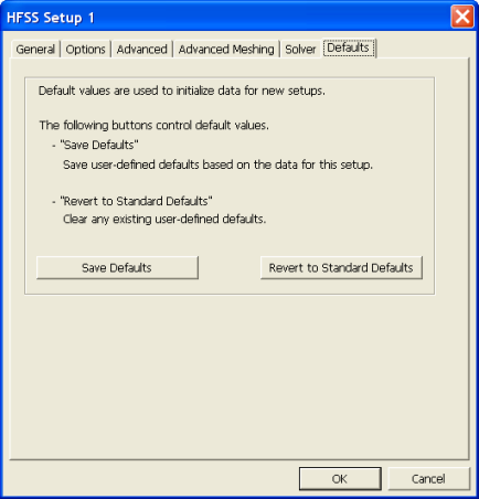 HFSS and Planar EM Simulators > HFSS Setup: Defaults TabClick the Defaults tab of the Add HFSS Solution Setup dialog to access the following settings. ![]() Use the Defaults tab of the HFSS Setup dialog to: Save Defaults: Save user-defined defaults based on the data for this setup (for all tabs). Revert to Standard Defaults: Clear any existing user-defined defaults (for all tabs).