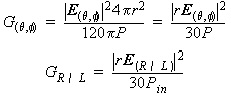 HFSS and Planar EM Simulators > Radiated Fields GainGain is defined as the ratio of the radiation intensity in a specific direction to the power. Four values of gain are calculated, the gain based on the accepted power and input power, and the gain based on the RHCP and LHCP components of the E-field. Designer calculates gain from the following equations: