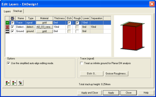 HFSS and Planar EM Simulators > Stackup Tab ControlsIn the Edit Layers dialog, select the Stackup tab. This opens the Edit Layers Stackup dialog: ![]()