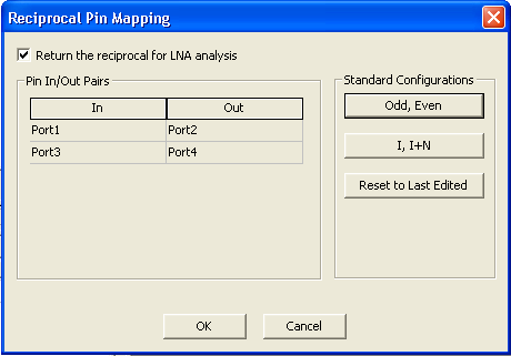 To enable the reciprocal operation, click the box Return the reciprocal for LNA analysis. Use the Standard Configurations buttons to select the pin mapping configuration used by your subcircuit. The illustration above shows the Odd, Even configuration with four ports; the odd-numbered ports 1 and 3 are the inputs and the even-numbered ports 2 and 4 are the corresponding outputs. The figure below shows the I, I+N configuration; now the inputs are ports 1 and 2, while the corresponding outputs are ports 3 and 4.
