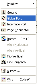 The cursor, now carrying a global port symbol for placement, moves to the center of the schematic window. To place the global port, click at the desired location. To end the placement operation, do either of the following: Press ENTER, the SPACEBAR, BACKSPACE, or ESC on your keyboard. Right-click, and then select Place and Finish, Finish, Cancel, or Back.