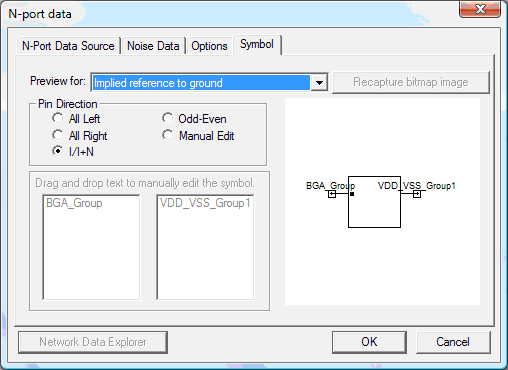 Recapture bitmap image: When enabled, this option allows you to restore the original bitmap image of the symbol. Pin Direction: The pin direction option may be set to one of the following: — All Left — All Right — I/I+N — Odd-Even — Manual Edit If you choose Manual Edit, use the windows at lower left to Drag and drop text to manually edit the symbol Network Data Explorer: Allows you to view solution data by opening the Network Data Explorer.