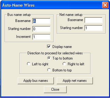 Schematic Editor > Net and Bus Auto-NamingSelected wires can be named as a group with either bus-style names or net-style names (A[0], W1) using the Auto-Name Wires dialog. In the Schematic Editor, select the wires to be auto-named, then left-click on Schematic in the top menu bar and select Auto-Name Wires . The Auto-Name Wires dialog box opens.