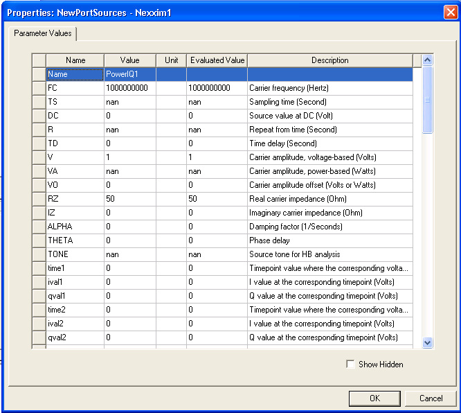 Click in the Name field to assign a name other than the default (“PowerIQn”). Assign new values or units to the source parameters in the Parameters window by clicking in the Value or Unit field to be changed. To assign the IQ time and data point manually, either enter the values in the time, ival, and qval parameter fields, or scroll down to the bottom of the property listing and click theIQ Data button. The IQ Data dialog opens: