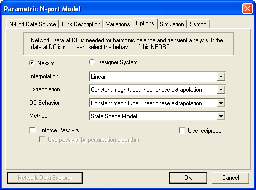 Nexxim/Designer — Sets the NPort type Interpolation — Specifies the interpolation as Step or Linear Extrapolation — Specifies the type of extrapolation that is to be used with the NPort DC Behavior — Specifies the type of DC behavior that is to be used with the NPort Method — Specifies the method used to convert frequency domain data to the time domain Enforce Passivity — Enforces a passivity check which tests whether the S-parameter data is passive or not. Passive devices can only dissipate, or temporarily store energy, but never generate it. Use reciprocal — Computes the inverse, or reciprocal, at each frequency so that the N-port can be used for de-embedding Network Data Explorer — Allows you to view and manipulate network data by opening the Network Data Explorer.