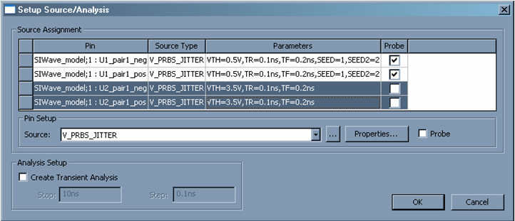 This dialog allows the user to add sources to the project. Sources are connected to the appropriate drivers that have been configured for each of the signal pins. A transient analysis can also be set up, which streamlines the process. The fields in the dialog reflect customizations made to the Sources/Probe pin which allows for toggling the existence of a probe for the IBIS buffer. By default, a PRBS source with jitter is assigned to each signal pin. Sources will be attached to the logic pin on the IBIS buffer (if applicable), not the actual signal pin. The Source selection box lists only the independent sources in the project. Grounds will be automatically added to the other side of the source. You can click the browse button (…) to load another source and then click Properties to set the per-instance properties for the source. Checking the Probe box will attach a probe directly to the selected pin. In the Analysis Setup area, you can set up a quick transient analysis by checking Create Transient Analysis, which enables the Stop and Step boxes for controlling the analysis. After the dialog is closed, the setup can be further refined from the project tree.