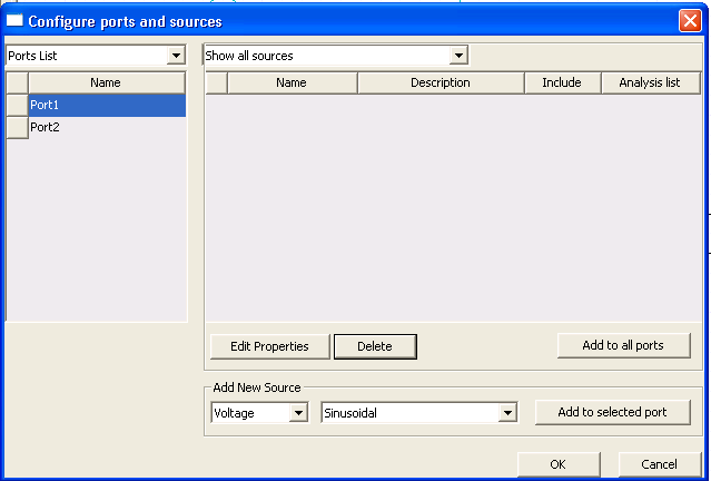 Schematic Editor > Sources in Nexxim SchematicsThe Configure Sources dialog allows you to create power, voltage, or current sources, then associate each source with a particular port and with a particular analysis. The Configure Sources facility allows you to specify the ports and sources to be incorporated in a given analysis. Power Calculation for Nexxim Port Sources For all sources associated with ports in Nexxim, as in the following diagram: