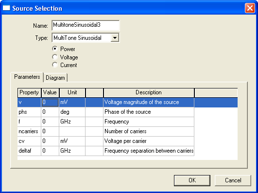 Select Voltage as the Source type. Click in the Name field to assign a name other than the default. In System designs, Port voltage sources can be Sinusoidal or Multitone Sinusoidal. Sinusoidal is the default. The display above shows the Sinusoidal parameters. To see a diagram of the waveform for this source, click the Diagram tab. The diagram is generalized, and does not change when you change parameter values. When all data for the source have been entered, click OK.