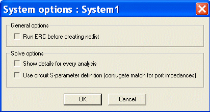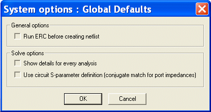 The following controls are available for both the local and global versions of the System Options dialog: Run ERC before creating netlist — Runs electrical rules checking for nets/nodes that are electrically connected but not physically connected. The ERC results display in the message window. The simulation proceeds regardless of the results of ERC. Show details for every analysis — Specifies that the Design icon in the Message window will expand to show all messages from the simulation as it runs. The default is not to expand the Design icon unless there are warnings. Use circuit S-parameter definition — Controls the definition for port impedances. For System designs, this option should typically be selected. The definition of a “matched port” depends on the application: — With applications that deal mostly with circuit quantities, including the Nexxim and System simulators, a “matched port” has a characteristic impedance that maximizes the power transfer. This is also called a “conjugate match.” — With applications that deal mostly with electromagnetic quantities, including HFSS and Planar EM, a “matched port” has a characteristic impedance that maximizes the transfer of the voltage wave. The two definitions differ only by the conjugate of the characteristic impedance of the port. For real port impedances, there is no difference.