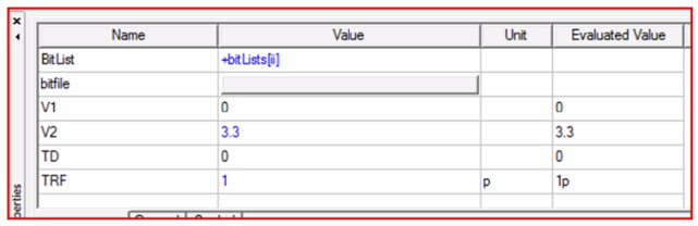 The index for a text array variable reference can either be a constant (1) or can be an index (ii) or even an expression (ii + 1). This allows you to sweep the index and simulate for different values that are stored in the array variable itself. In particular, it also enables you to sweep different text strings. This allows you to set a property to different string values as the index is swept. Following are the properties that currently allow text array variables: V_PRBS V_PRBS_JITTER V_PRBSD V_PRBSG_JITTER V_PSK V_QAM V_CPM