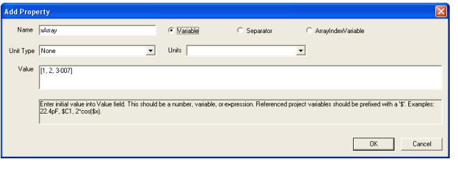 Variables in Designer > Defining Array VariablesYou can define array variables that contain numbers or strings. Number array variables can be used in component property expressions, while string array variables can be used in certain component property values. To define an array variable, first use either of the following methods to define either a Local variable or a Project variable: Defining Local Variables — To define a local variable, in the Project menu, right-click the project name and select Project Variables. Defining Project Variables — To define a project variable, in the Project menu, right-click the design name and select Design Properties. This will open a Properties dialog. After opening a Properties dialog to define either a local variable or a project variable, click Add, and the Add Property dialog opens:
