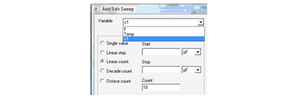 Click the Add button to open an Add Sweep dialog that lets you select from a drop-down list of non-fixed variables.