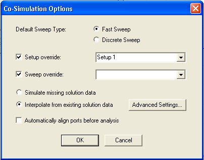 Overriding Subcircuit Setup During Cosimulation with Planar EM You can modify the auto-generated subcircuit simulation setup for cosimulation with Planar EM. Create a setup and a sweep in Planar EM, then invoke the Cosimulation options dialog: ![]() This will setup the Planar EM subcircuit to always use the specified setup/sweep at cosimulation time.