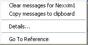 If you right click in the Message Manager window, the following popup menu appears: ![]() Clear messages — Clears the messages for the current model. Copy messages to clipboard — Copies the selected message to the clipboard. Details — Brings up an information dialog with the project and design for the selected message. Go To Reference — Invokes the action that is associated with the selected message.