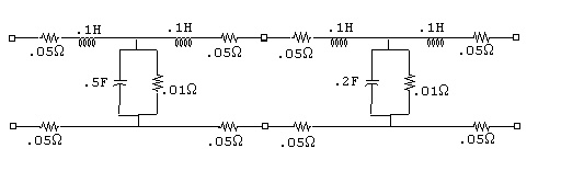The example subcircuits given earlier reference the following parameters: ser_res and par_res for the serial and parallel resistors, ser_ind for the serial inductors, and par_cap for the parallel capacitor. The earlier examples do not show where the parameters get their values. Here is a more complete netlist fragment which gives definitions for all the parameters. * Lossy transmission line fragment with parameters .PARAM ser_res=.05 Xtrans1 send1 GND 10 20 LINESEG Xtrans2 11 21 rcv1 GND LINESEG par_cap=.2 .SUBCKT LINESEG insig inref outsig outref ser_ind=.1 Xleft insig local1 sub1 Xright outsig local1 sub1 Xmid local1 local2 sub3 Rleft inref local2 ser_res Rright local2 outref ser_res .ENDS $ End of LINESEG .SUBCKT sub1 sub1in sub1out R1 sub1in sub1local ser_res L1 sub1local sub1out ser_ind .ENDS $ End of sub1 .SUBCKT sub2 sub2in sub2out par_cap=.5 par_res=.01 C3 sub2in sub2out par_cap R3 sub2in sub2out par_res .ENDS $ End of sub2 .END $ End of Netlist Here is the resulting circuit fragment, with device values: Figure 2. Lossy Transmission Line Segment with Device Values