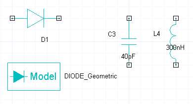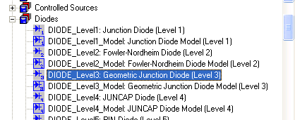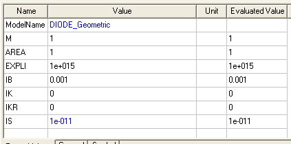 property to a unique name. We have used DIODE_Geometric. 11. Click on the DIODE_Level3_Model: element, hold down the mouse key and drag the diode model symbol into the design window. Locate the model symbol right below the diode symbol. Press Enter to drop the model symbol. 12. Click on the diode model symbol to display its properties in the Property panel. Set the ModelName property to DIODE_Geometric. Set the IS property (saturation current) to 1e-11 (amperes).