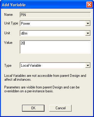 Set the Unit Type to Power, the Unit to dBm, and the Value to 20 as shown. Click OK. 26. Set the FREQ property to FLO. The Add Variable dialog opens: